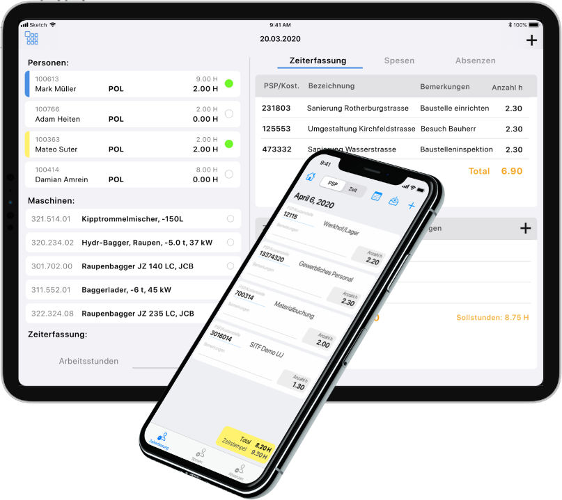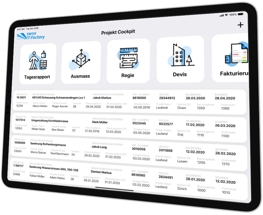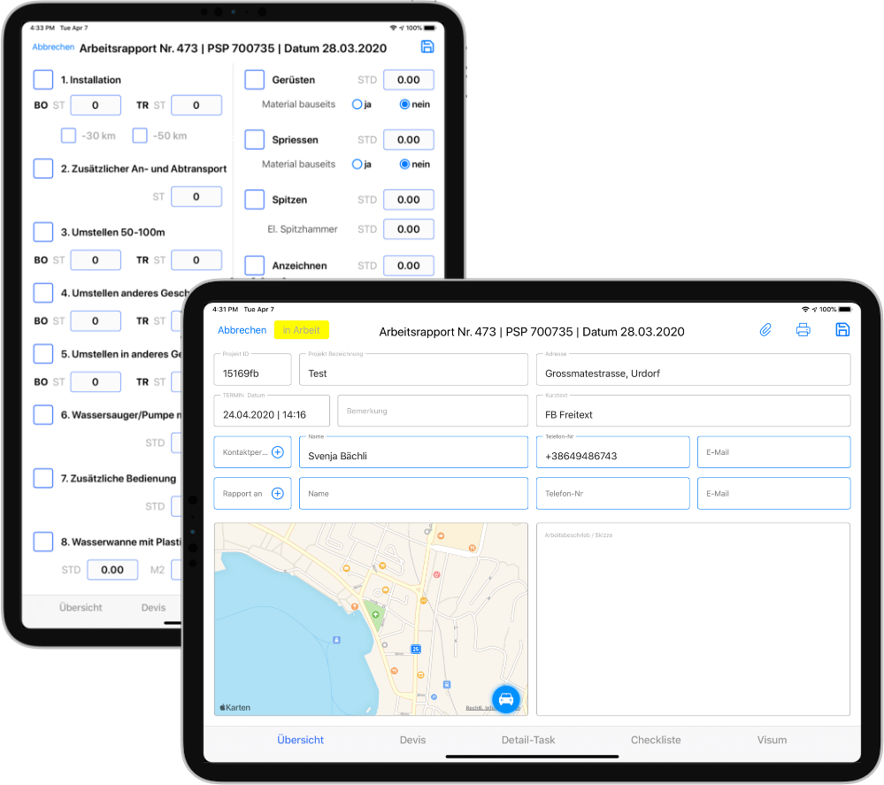 Daily task-/time-report, quantity surveying, additional efforts, etc., mobile on the tablet. The app is seamlessly integrated into the existing all-in-one solution